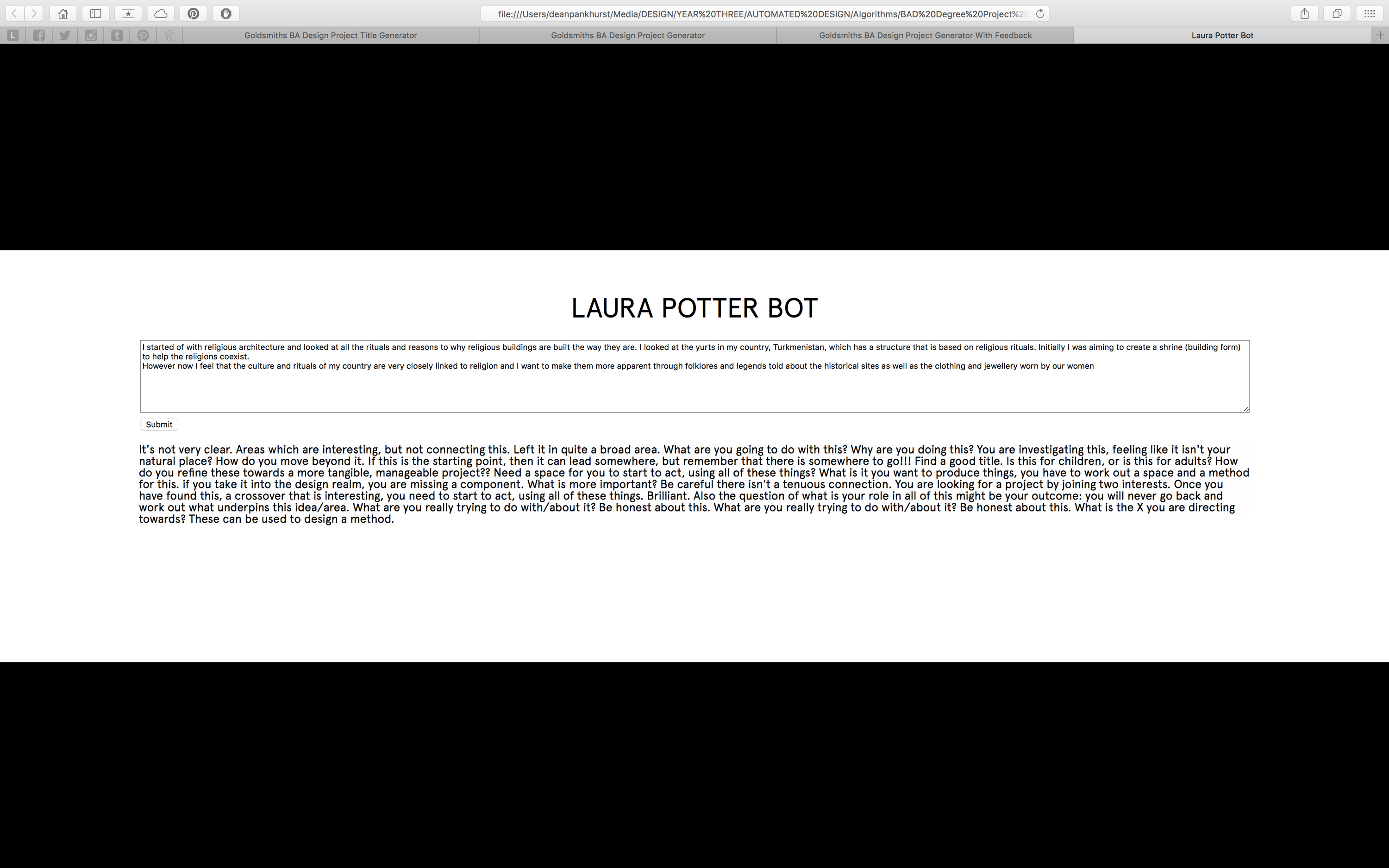 Natural language processing chat-bot built from historic tutorial feedback from a tutor on the course. A student can ask the bot for guidance in lieu of the real tutor, on demand.